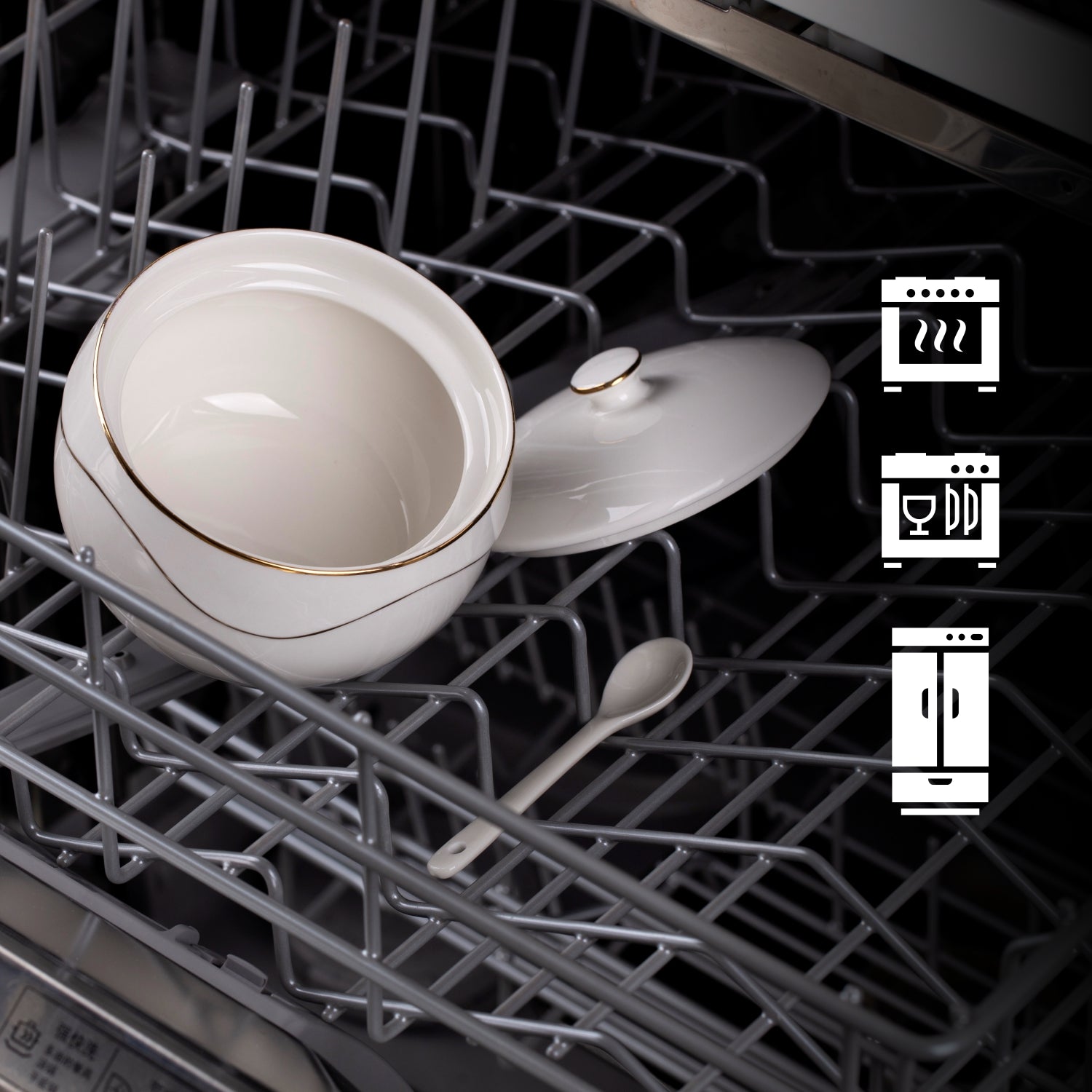 11oz sugar container with spoon and lid for kitchen coffee bar accessories,oven freezer safe,elegant style with golden trim,bring a little luxury to you,90-DAY GUARANTEE.