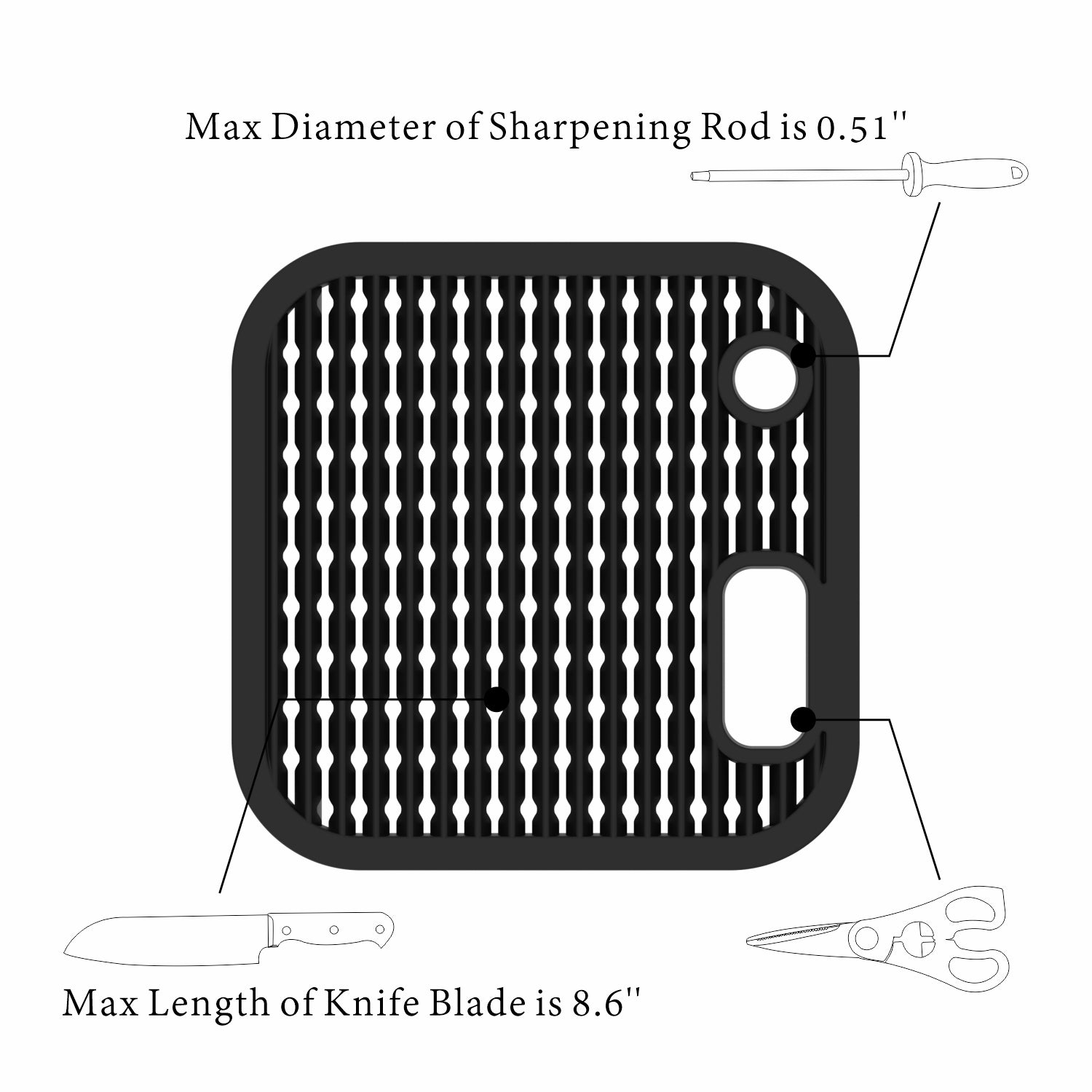 - Our universal knives block can store any knife up to 8.6 inches (blade) with any blade shape safely.