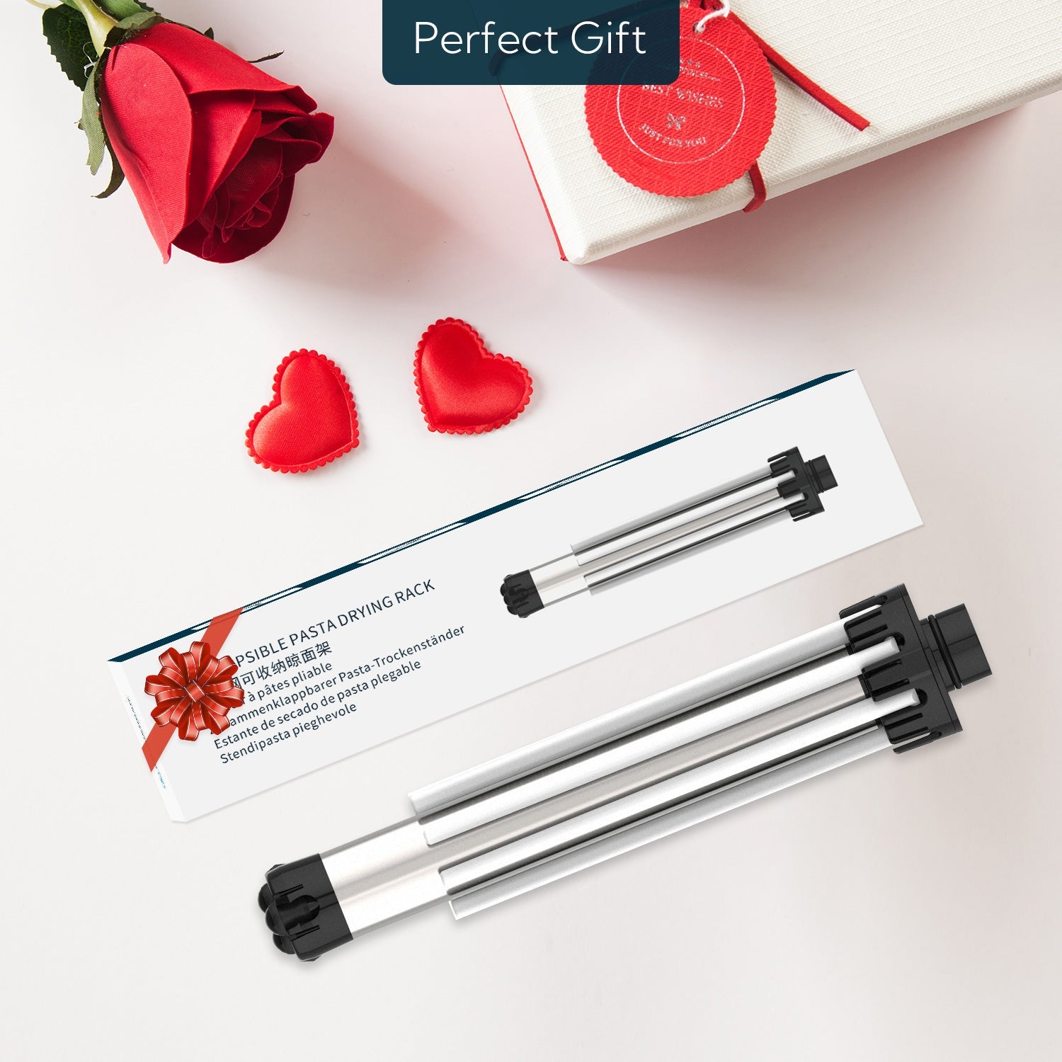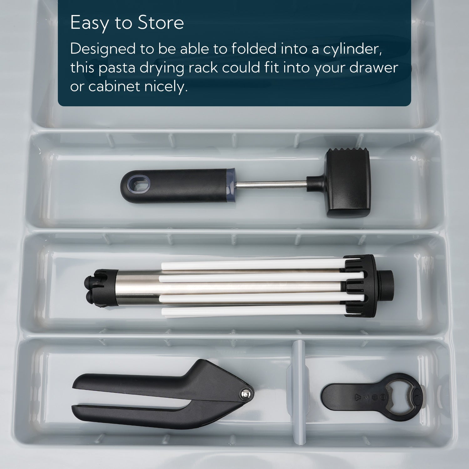 This pasta dryer rack is collapsible for easy storage. It saves space and fits nicely in the drawer or cabinet.