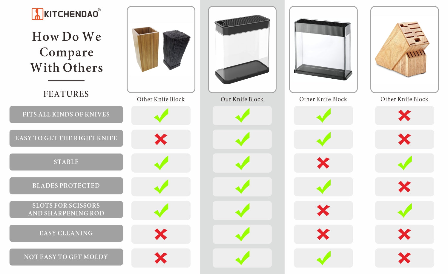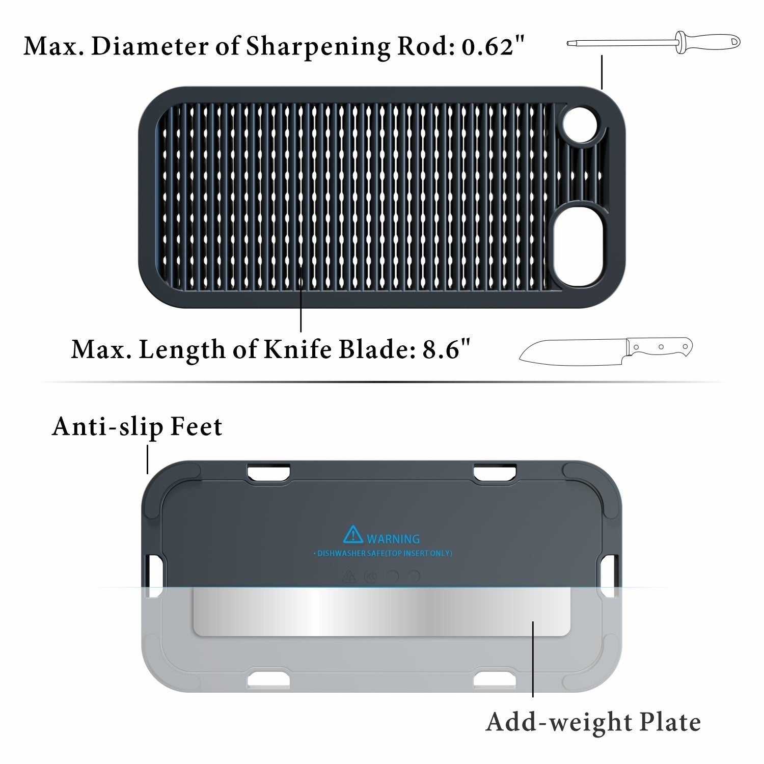 - Our universal knife block can store any knife up to 8.5 inch(blade only) with any blade shape safely.